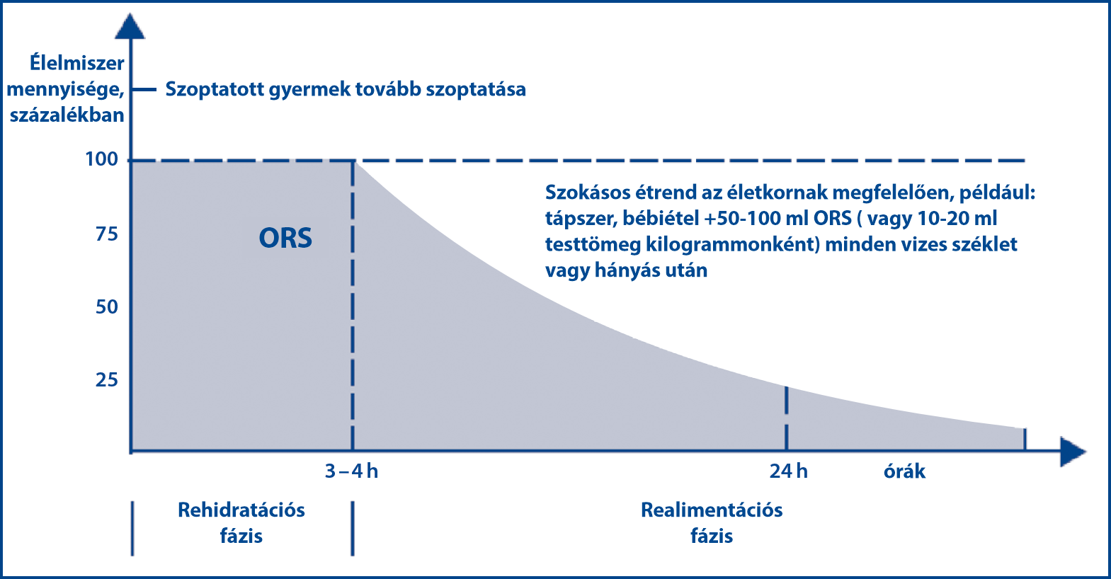 - A hozzátáplálás alatt álló csecsemők a rehidrálási fázis után teljes mennyiségben és koncentrációban kapják a megszokott tápszert és ételt. Súlyos esetekben azonban a rehidratálás fokozatosan is biztosítható.